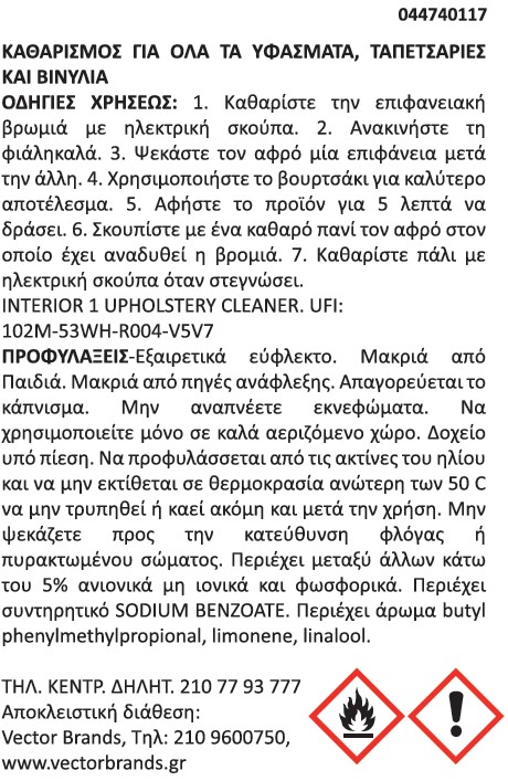 Το ισχυρό καθαριστικό ταπετσαρίας εξαφανίζει βρωμιές και ρύπους από όλα τα υφάσματα, ταπετσαρίες και βινύλια. Εξαιρετικά αποτελεσματικό στον τοπικό καθαρισμό για την αφαίρεση λεκέδων. Κατάλληλο και για οικιακής χρήσης γενικό καθαρισμό.